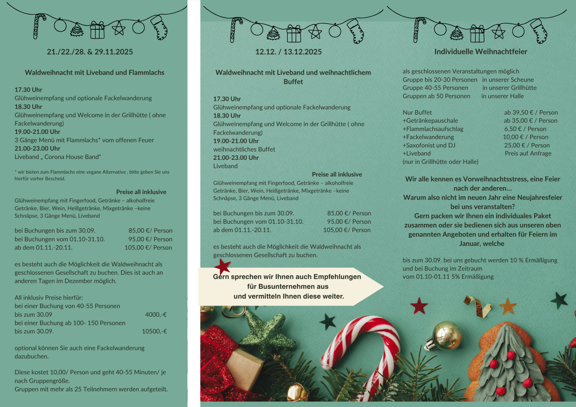 Es erwartet Sie ab 17.00 Uhr die Feuerschale vor der Grillhütte und drin werden Sie in unserer weihnachtlich geschmückten Grillhütte mit einem Welcome-Drink und einem köstlichen weihnachtlichen 3 Gänge Menü herzlich empfangen.