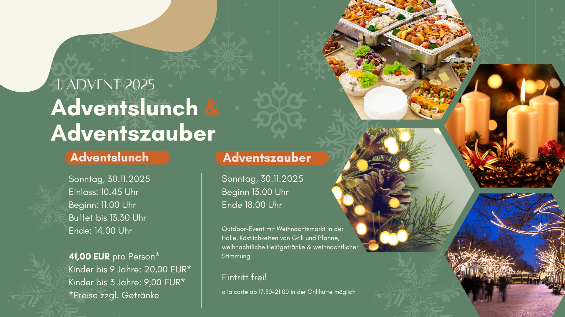 Outdoor-Event mit Weihnachtsmarkt in der Halle, Köstlichkeiten von Grill und Pfanne, weihnachtliche Heißgetränke & weihnachtlicher Stimmung.
