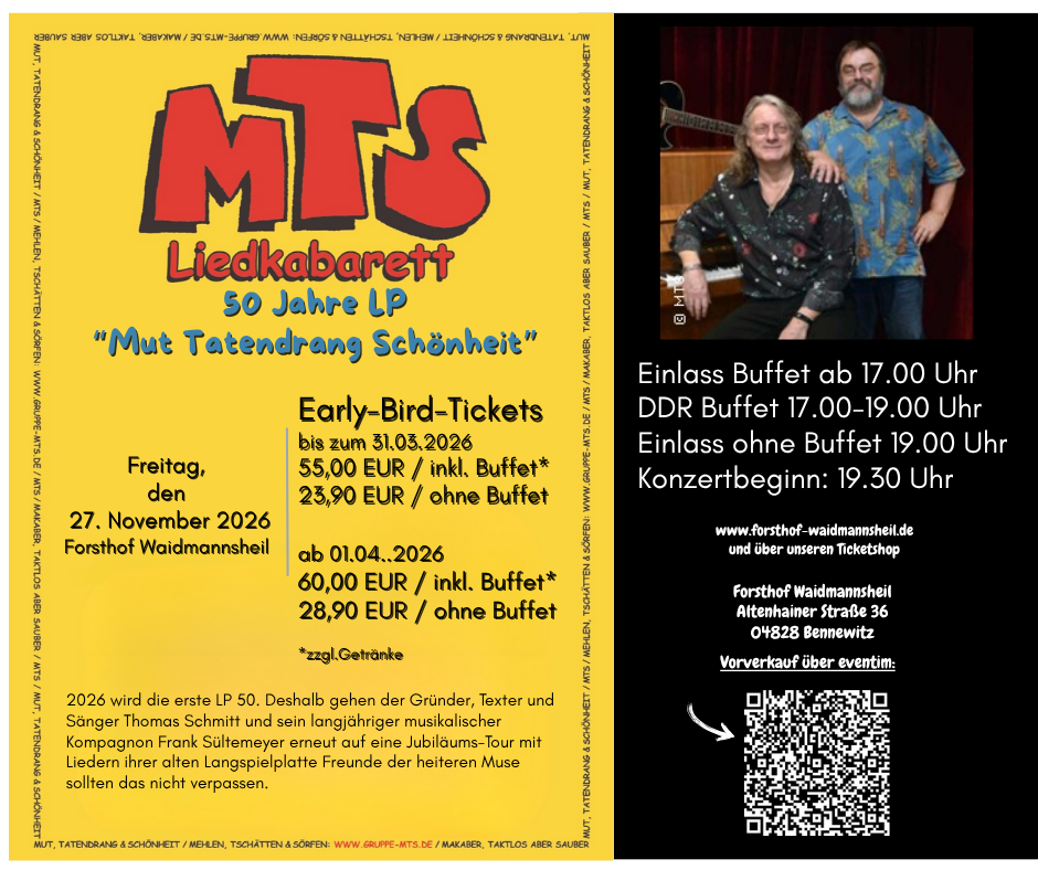 Deshalb gehen der Gründer, Texter und Sänger Thomas Schmitt und sein langjähriger musikalischer Kompagnon Frank Sültemeyer erneut auf eine Jubiläums-Tour mit Liedern ihrer alten Langspielplatte Freunde der heiteren Muse sollten das nicht verpassen.