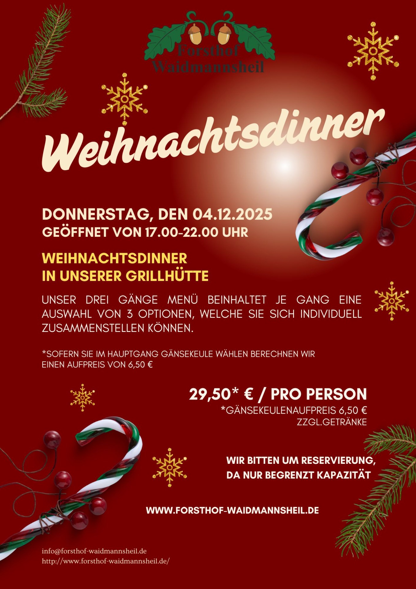 Es erwartet Sie ab 17.00 Uhr die Feuerschale vor der Grillhütte und drin werden Sie in unserer weihnachtlich geschmückten Grillhütte mit einem Welcome-Drink und einem köstlichen weihnachtlichen 3 Gänge Menü herzlich empfangen.